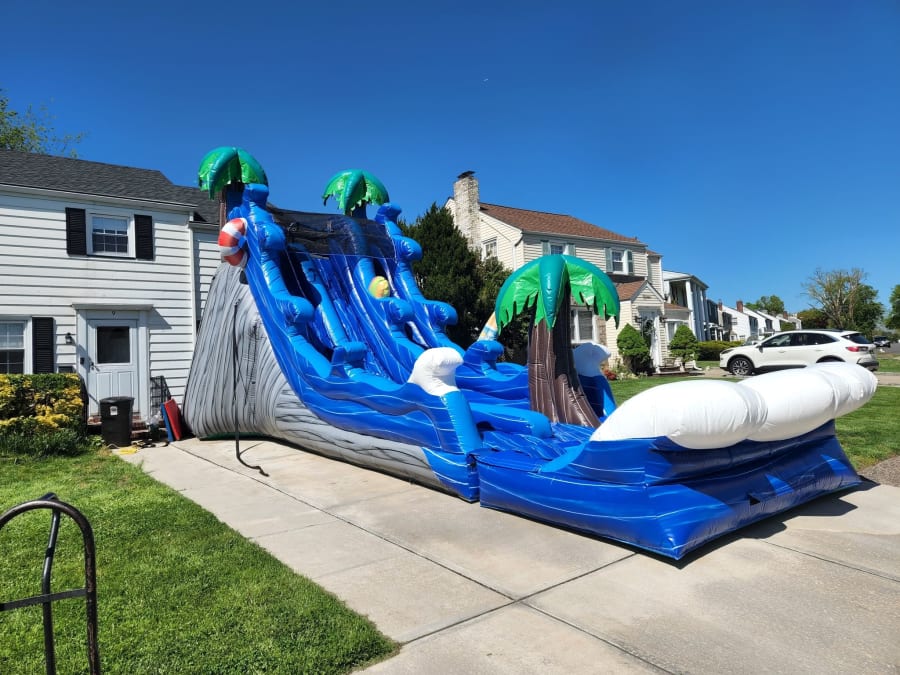 Bring Malibu to you with our 20' Malibu Dual Lane slide. This unit features cool waves, palm trees, a beach ball, life buoy, and a surfboard for added attraction. It can be used dry or wet with its pool attachment for an additional $66.