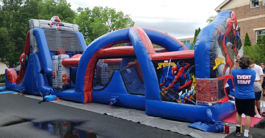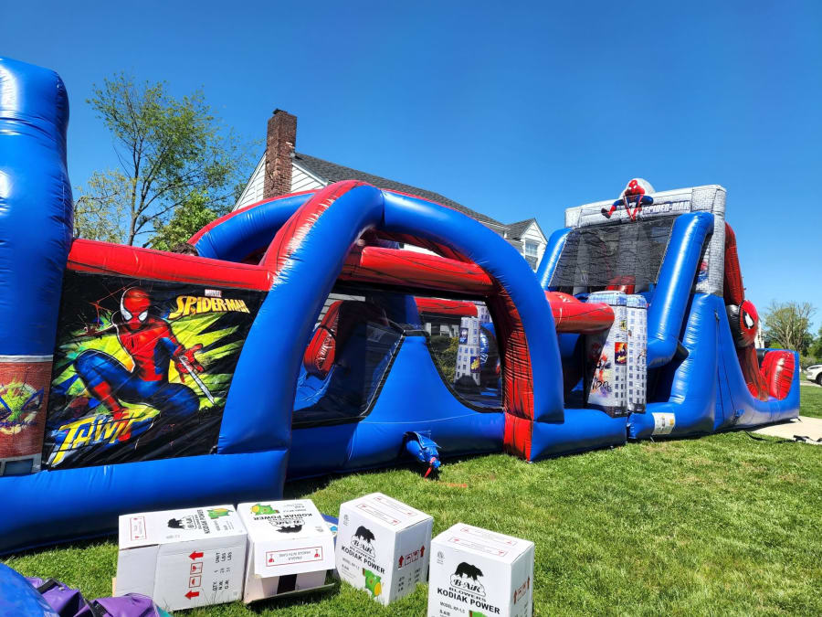 This 50 foot long Wet/Dry Spider-Man Obstacle Course has non-slip material which provides safe use with water. The first section features a bounce & obstacle area, with small climber/slide and Spider-Man and Carnage character obstacle pop-ups. The rear section features tall climber/slide skyscraper unit with a water misting system that sprays participants as they slide down into the splash zone. The Spider-Man 50' Obstacle Course is designed with fully licensed digital artwork. It is an amazing attraction for your Little Super Hero.