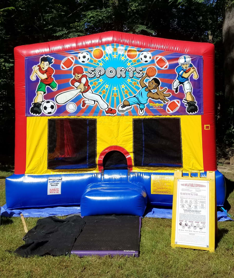 This is our classic modular bounce house with a Paw Patrol banner. It has bright red, yellow, and blue colors that stand out of the crowd. Ask about our removable banner options.
