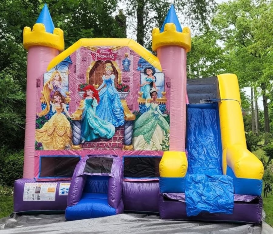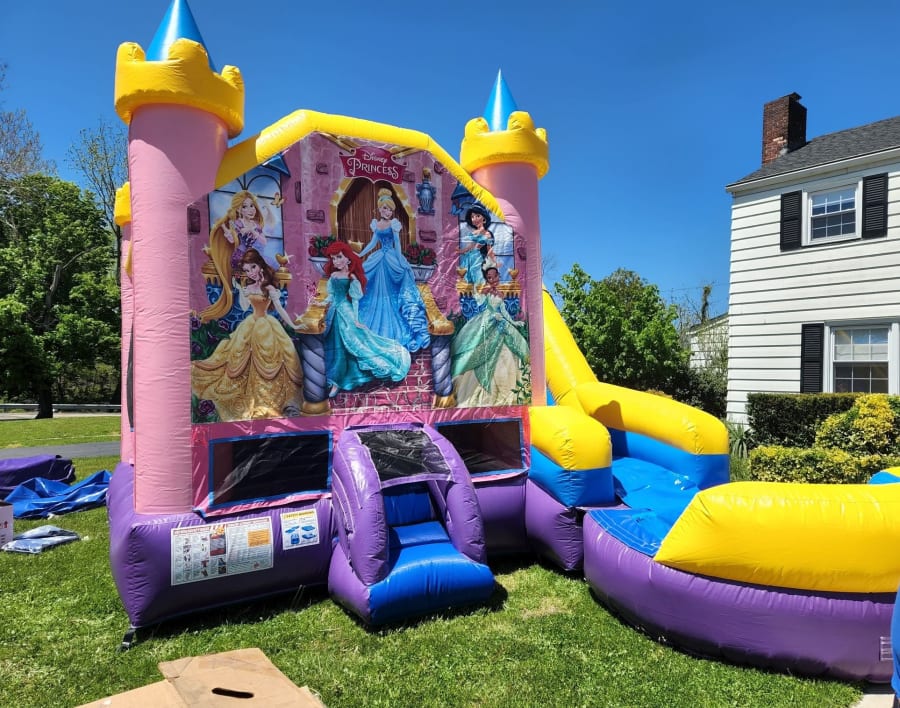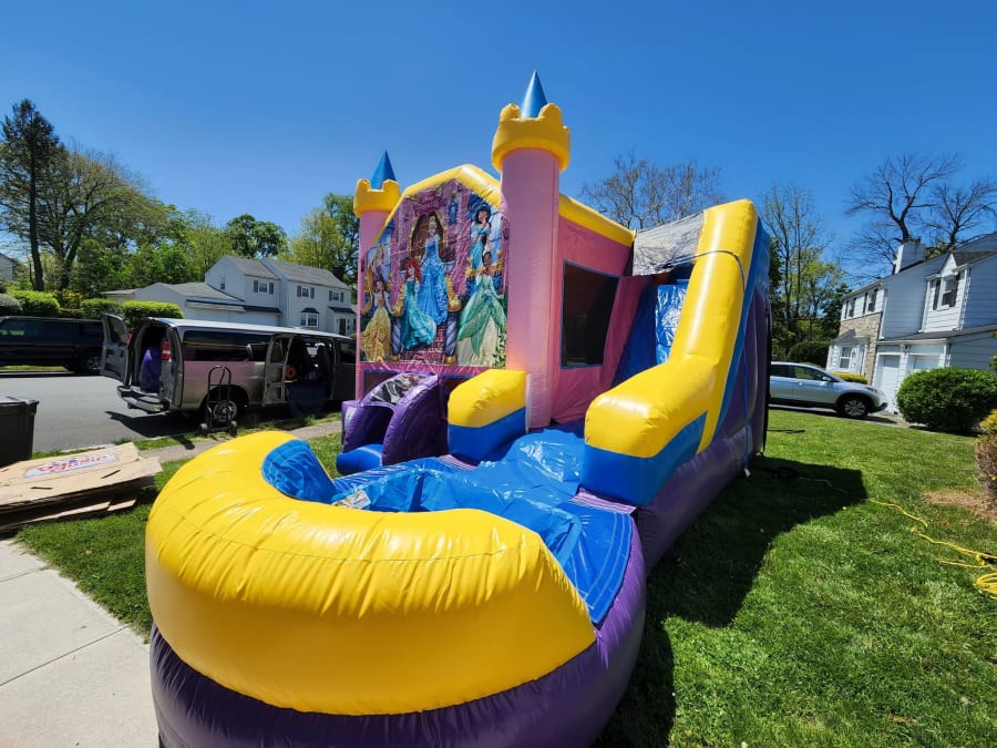 Make their fairy tale come true by transforming your princesses' party into a magical celebration. Our officially licensed Wet/Dry Disney Princess combo unit has non-slip material which provides safe use with water when used with it's pool attachment. The Disney Princess features a bouncing area, a basketball hoop, Princess pop-ups, a wall climber, and a slide. It can be used dry or wet with its pool attachment for an additional $66.