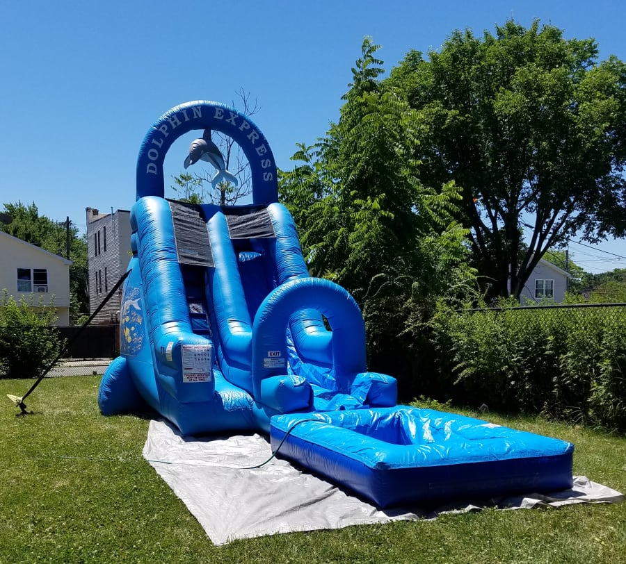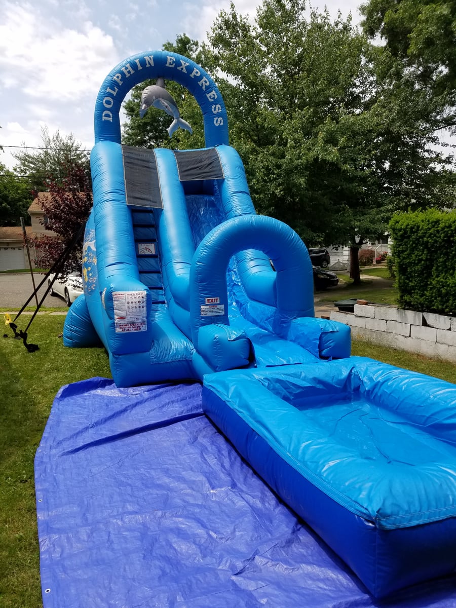 Our 18’ Dolphin Express can be used as a dry slide or a water slide with the pool attachment. A sure hit for all aquatic fans! It can be used dry or wet with its pool attachment for an additional $66.
